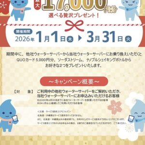 期間中に、他社ウォーターサーバーから当社ウォーターサーバーに乗り換えると、「QUOカード5,000円分」「ソーダストリーム」「ナノブルシェイキングボトル」の中から、お好きな2つをプレゼントいたします。